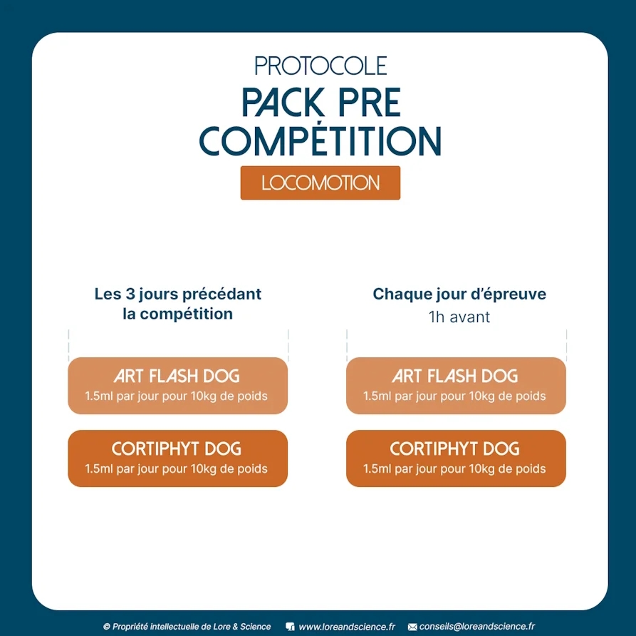 Pack Pre Compétition permet une préparation parfaite pour la mobilité, les articulations et tendons. Idéal pour la préparation d’épreuve sportive comme le ring ou l’agility, ce pack contient Cortiphyt Dog & Art Flash Dog