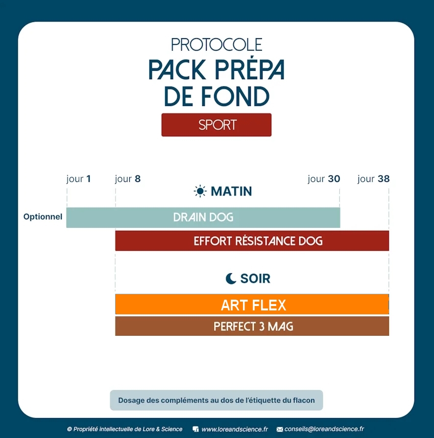 Le Pack Prépa de fond est un pack d’aliments complémentaires naturels en aide à la préparation pour le soutien à l’effort et l’endurance des chiens sportifs. Idéal en soutien pour la préparation d’épreuve sportive comme le ring ou l’agility, ce pack contient Effort Résistance Dog, Perfect 3 Mag & Art Flex